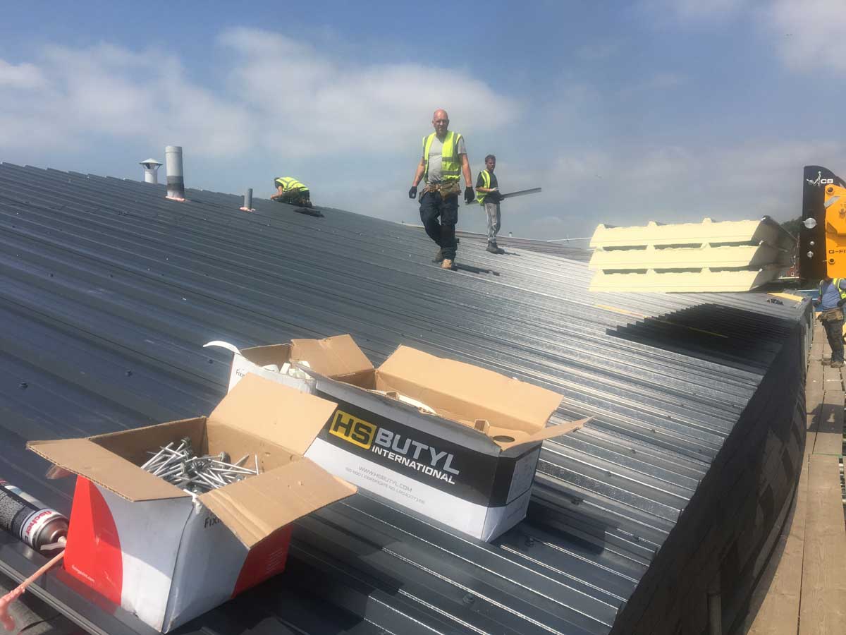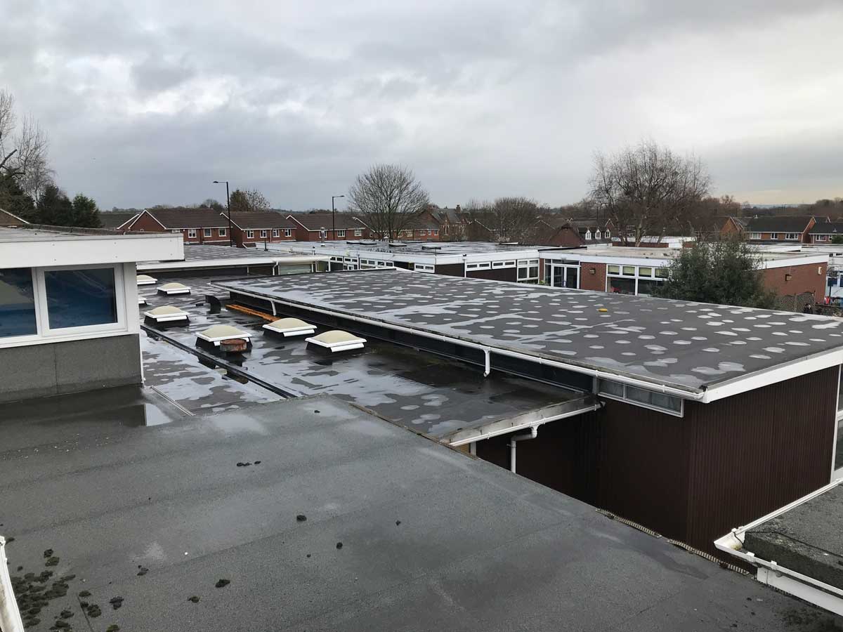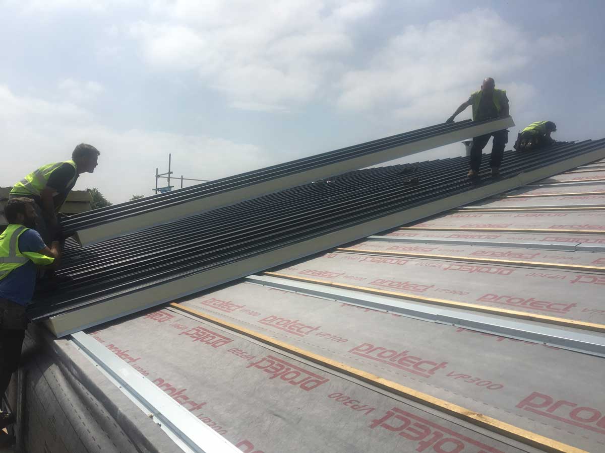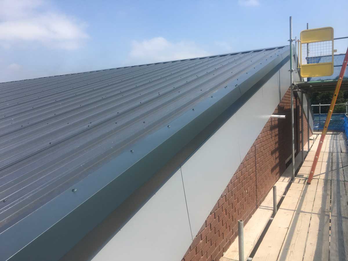 To completely strip existing concrete tiles and all associated lath battens and felts. To supply and install a new Kingspan 120mm composite roof panels including all associated mastics and flashings all installed to manufacturers specifications Client Name: Wordsley Academy Location: Wordsley